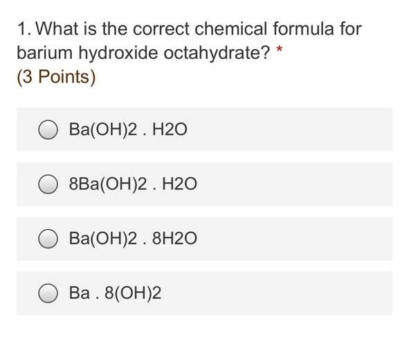What is the correct chemical formula for barium hydroxide octahydrate. The barium hydroxide chemical formula is BaOH 2. At 100 C in a vacuum the monohydrate will yield BaO and water.